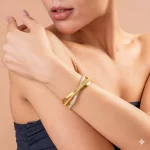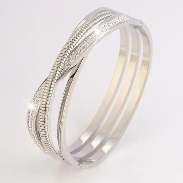 This stunning 18k gold-plated stainless steel bangle features an elegant intertwining design, with polished gold bands embracing