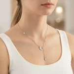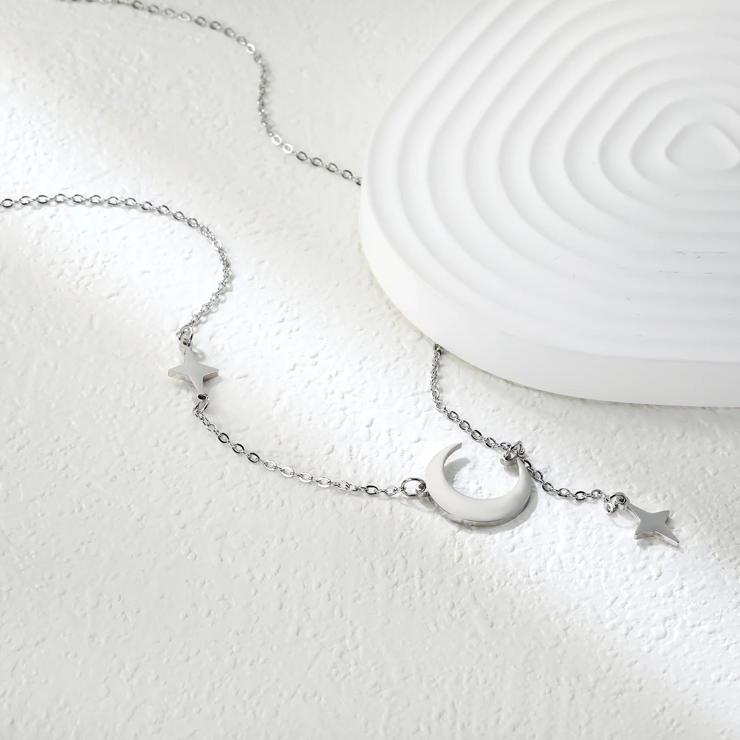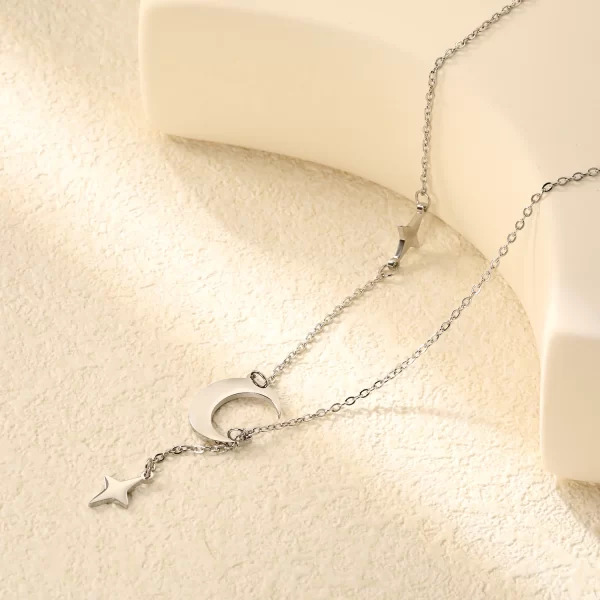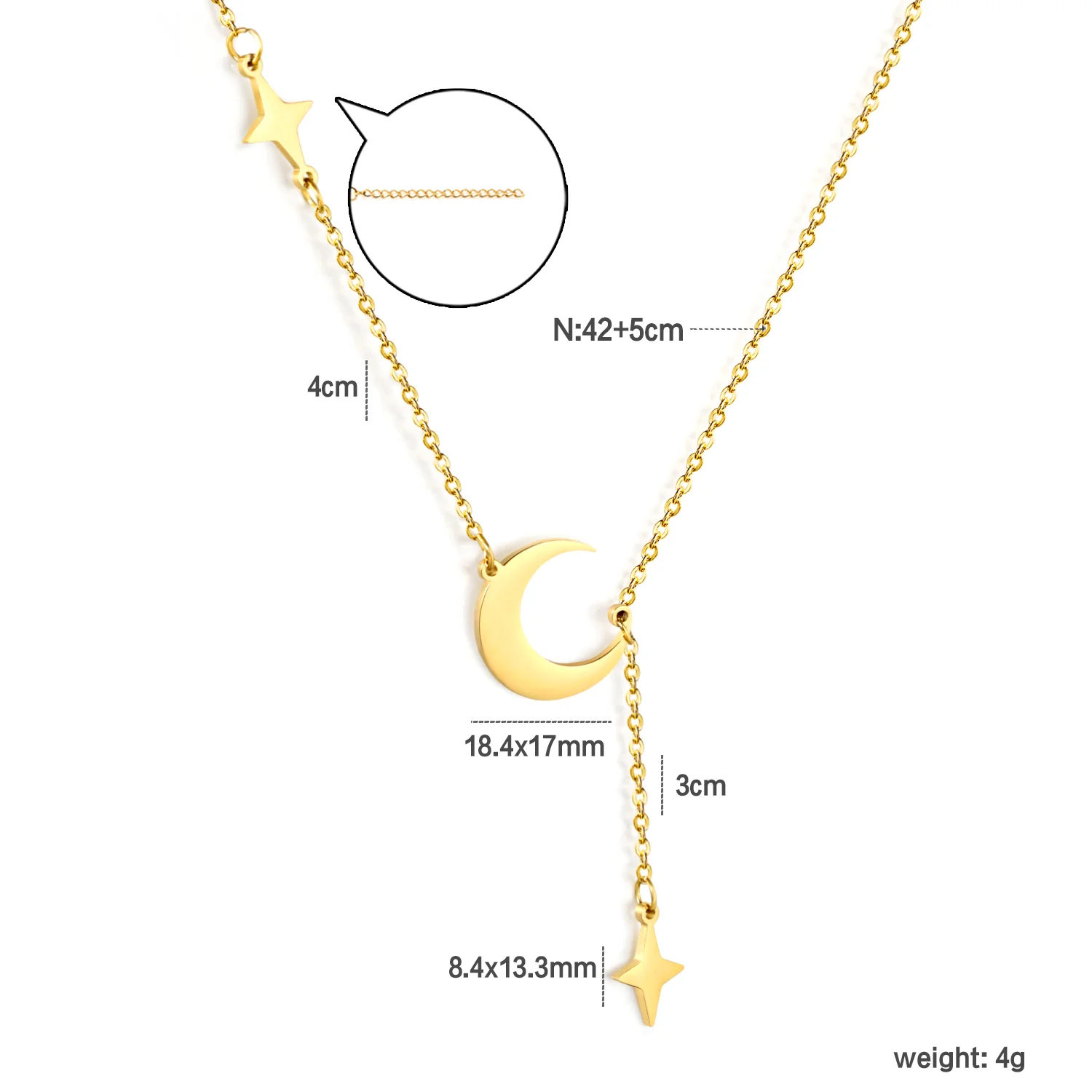 Embrace the enchantment of the night sky with our exquisite Celestial Cascade Necklace. This elegant piece features a delicate golden chain adorned with celestial charms. A crescent moon gracefully anchors the design, while a sparkling star rests near the clasp, and another dangles playfully at the end of a lariat-style drop. Crafted for timeless appeal, this necklace is perfect for adding a touch of sophisticated shimmer to any outfit, from casual wear to evening attire. Its unique design symbolizes dreams, guidance, and cosmic beauty, making it a meaningful addition to your jewelry collection or a thoughtful gift for someone special.