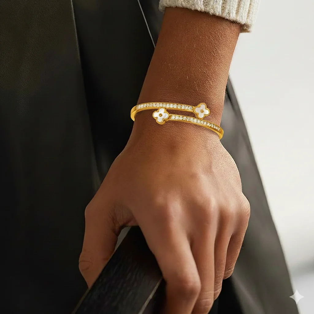 crafted from 18k gold-plated stainless steel, features a captivating open-cuff design. It’s adorned with delicate mother-of-pearl clover motifs and brilliant cubic zirconia stones, adding a touch of whimsical luxury. Perfect for celebrating luck and style, this bangle offers a refined gleam for any occasion.