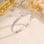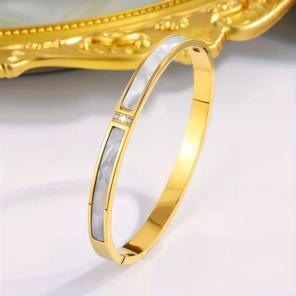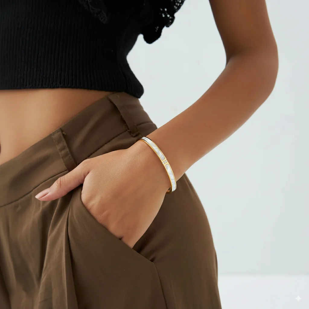 A fusion of modern sophistication and timeless charm. This polished gold-toned bangle features striking segments of shimmering mother-of-pearl, elegantly framed and accented with delicate, sparkling stones. Perfect for adding a touch of luminous refinement to any ensemble, it’s a versatile piece that effortlessly transitions from day to night.