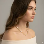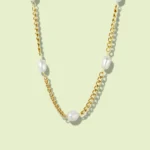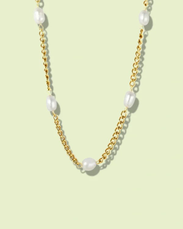This exquisite “Golden Dewdrop” necklace features lustrous, natural oval pearls gracefully spaced along a durable 3mm stainless steel 18k gold-plated chain. Blending classic elegance with modern resilience, this piece offers a sophisticated shimmer that’s perfect for elevating everyday wear or adding a touch of refined charm to special occasions.