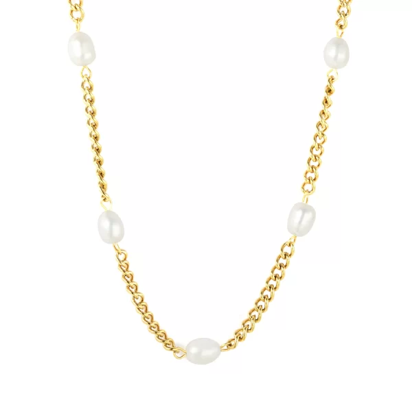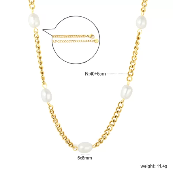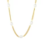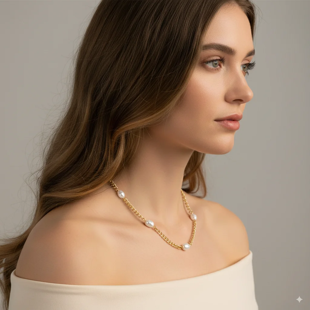 This exquisite “Golden Dewdrop” necklace features lustrous, natural oval pearls gracefully spaced along a durable 3mm stainless steel 18k gold-plated chain. Blending classic elegance with modern resilience, this piece offers a sophisticated shimmer that’s perfect for elevating everyday wear or adding a touch of refined charm to special occasions.