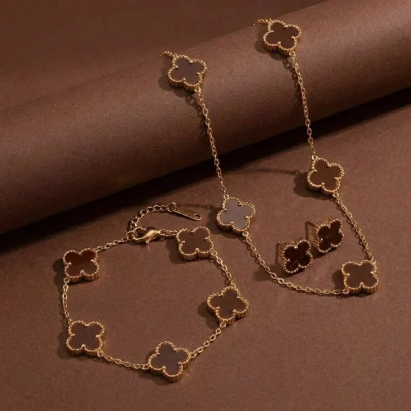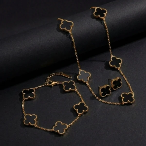 Discover timeless charm with our exquisite Clover Collection, meticulously crafted from durable 18K gold-plated stainless steel. Each piece, from the delicate necklace to the charming bracelet and elegant earrings, is designed to bring a touch of sophistication to your every moment. More than just jewelry, each color in our collection carries a unique sentiment, allowing you to express your inner self with grace. Embrace your unique style and let the Everlasting Clover Collection tell your story.