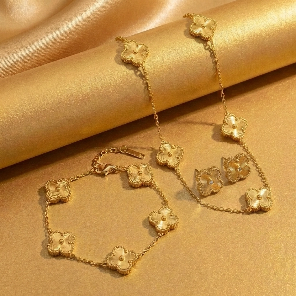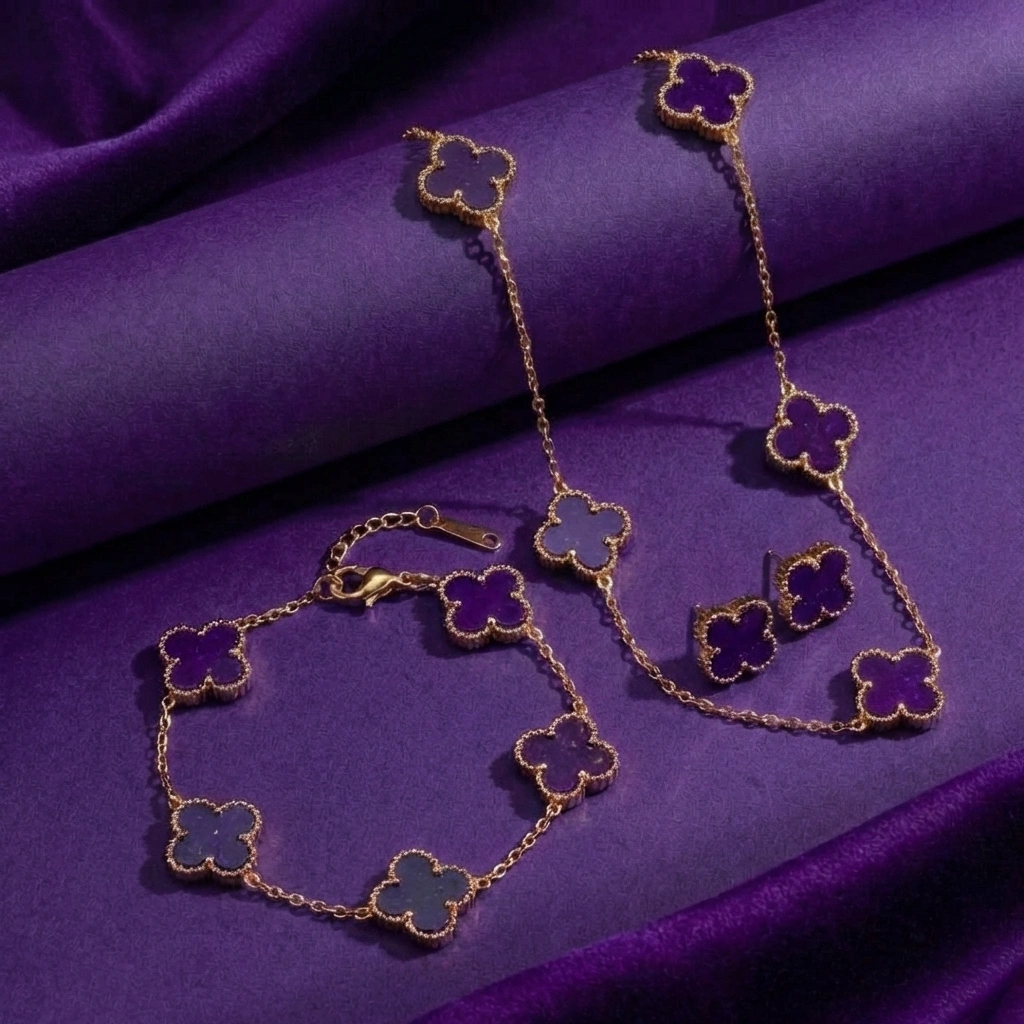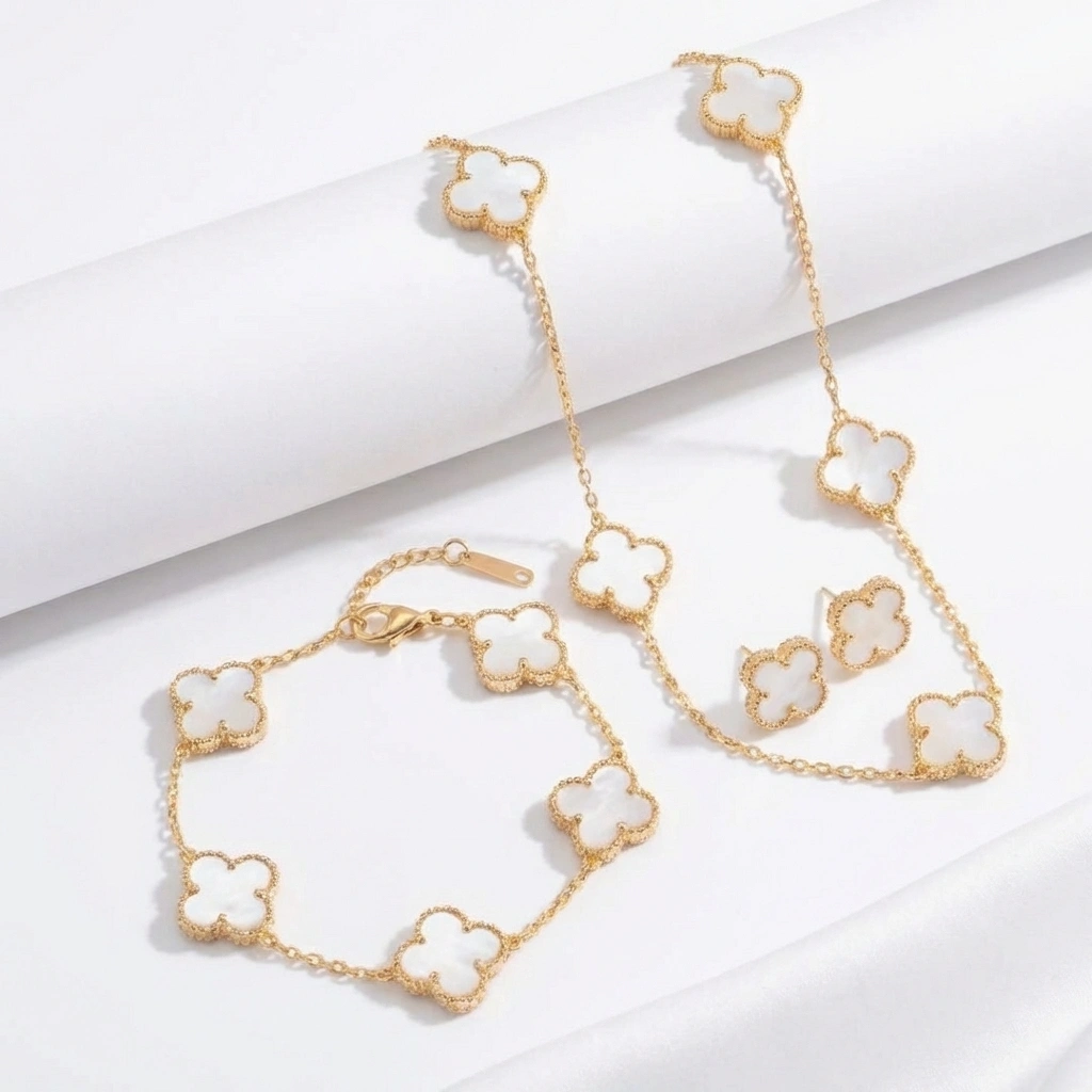 Discover timeless charm with our exquisite Clover Collection, meticulously crafted from durable 18K gold-plated stainless steel. Each piece, from the delicate necklace to the charming bracelet and elegant earrings, is designed to bring a touch of sophistication to your every moment. More than just jewelry, each color in our collection carries a unique sentiment, allowing you to express your inner self with grace. Embrace your unique style and let the Everlasting Clover Collection tell your story.
