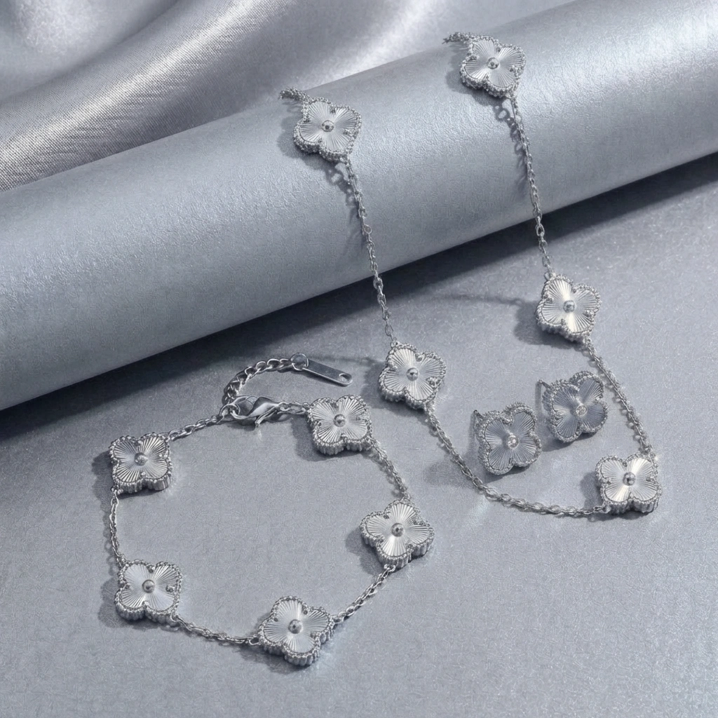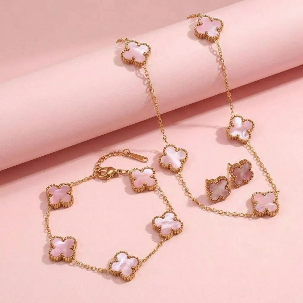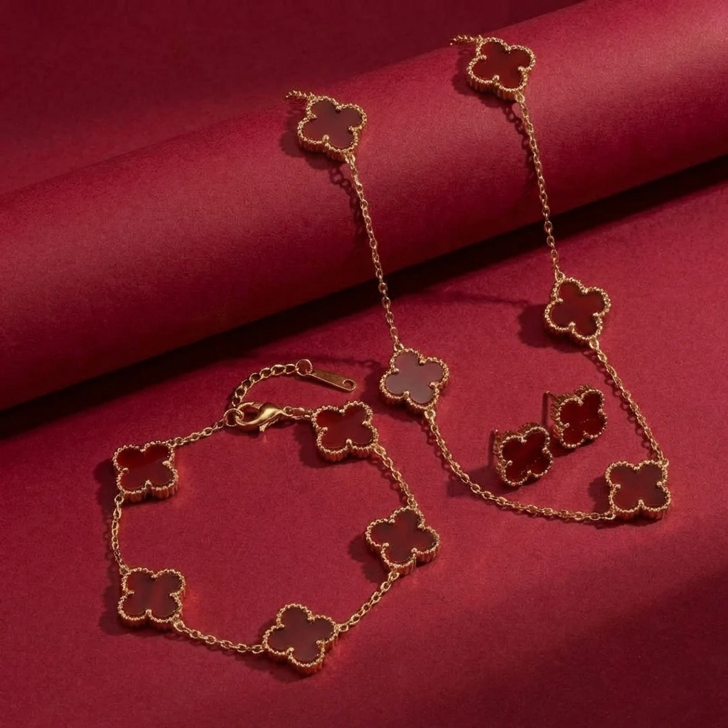 Discover timeless charm with our exquisite Clover Collection, meticulously crafted from durable 18K gold-plated stainless steel. Each piece, from the delicate necklace to the charming bracelet and elegant earrings, is designed to bring a touch of sophistication to your every moment. More than just jewelry, each color in our collection carries a unique sentiment, allowing you to express your inner self with grace. Embrace your unique style and let the Everlasting Clover Collection tell your story.