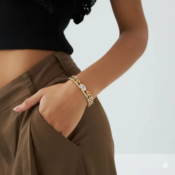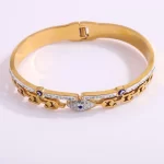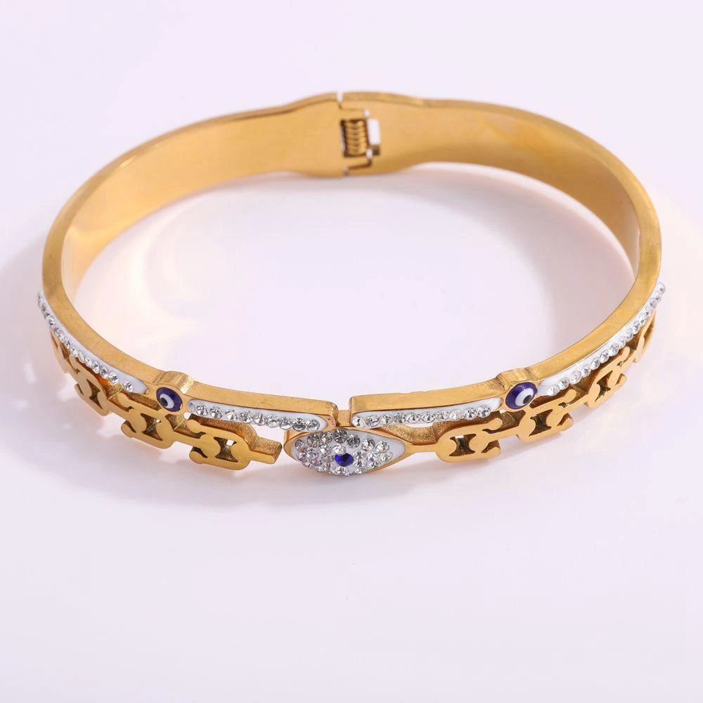 This exquisite 18k gold-plated stainless steel bangle, featuring bold chain-link accents, sparkles with pave-set cubic zirconia. Centered by a mesmerizing evil eye motif, adorned with brilliant blue and clear stones, it offers both captivating style and a symbolic touch of protection.