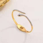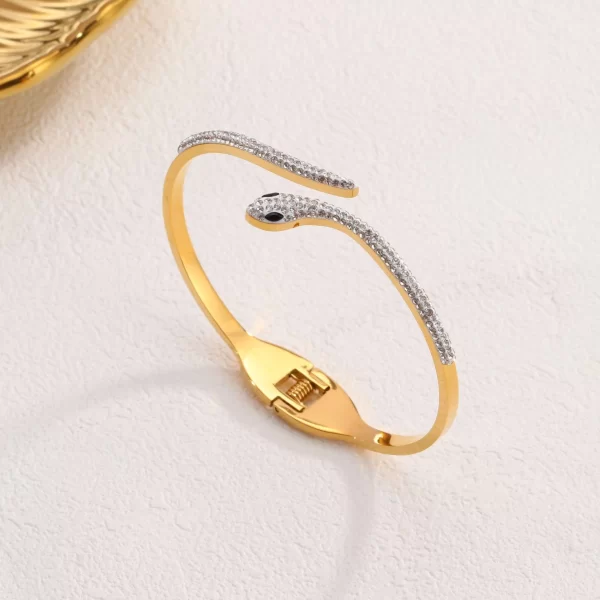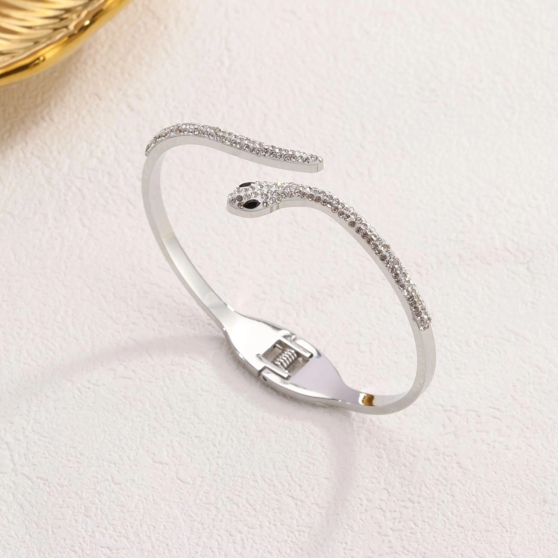 This captivating bracelet features a coiled snake design, meticulously adorned with sparkling cubic zirconia, and striking black enamel eyes. It’s a bold and elegant statement piece, perfect for adding a touch of exotic sophistication to any ensemble.